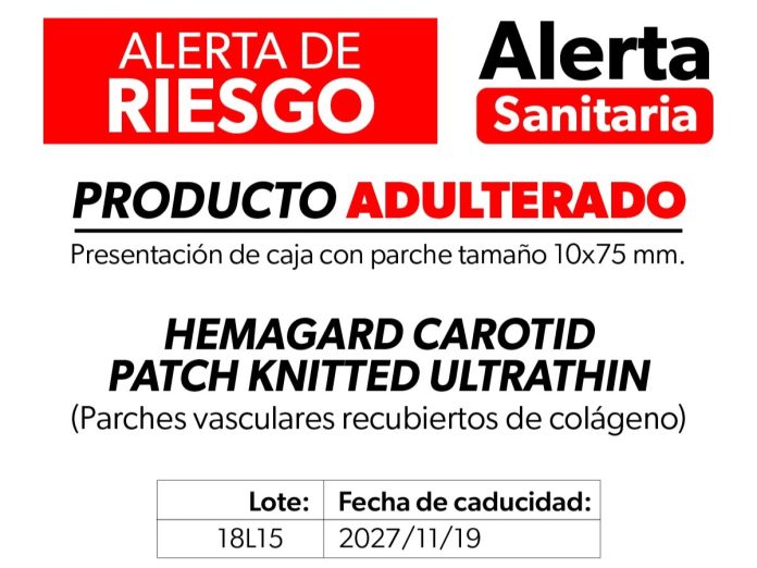 Morelia, Michoacán, 11 de febrero del 2026.- La Comisión Federal para la Protección contra Riesgos Sanitarios (Cofepris) a través de la Secretaría de Salud de Michoacán (SSM), informa a la población, profesionales de la salud, distribuidores y establecimientos médicos sobre la adulteración en la fecha de caducidad del dispositivo médico HEMAGARD Carotid Patch Knitted Ultrathin (Collagen Coated Vascular Patchs/Parches vasculares recubiertos de colágeno), en presentación de caja con parche tamaño 10 x 75 mm.