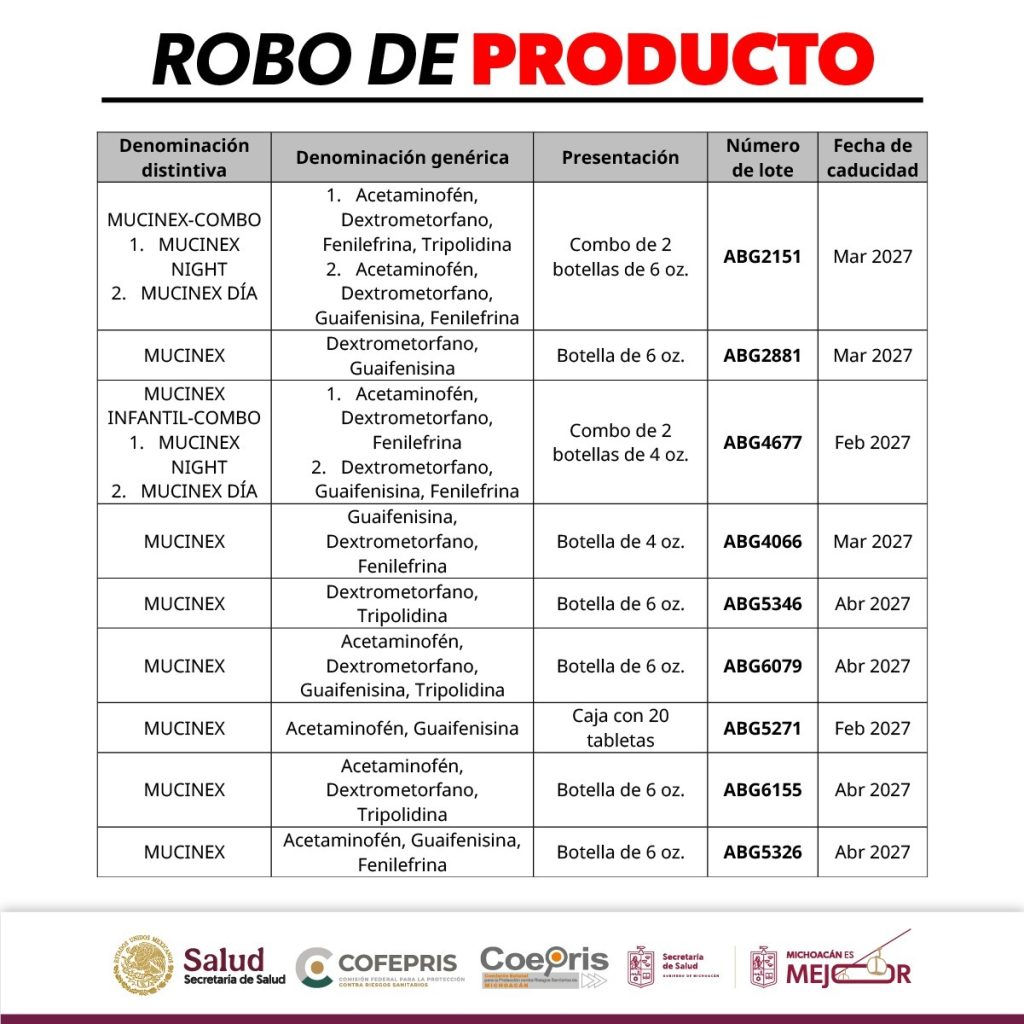 Morelia, Michoacán, 17 de febrero de 2026.- La Comisión Federal para la Protección contra Riesgos Sanitarios (Cofepris), a través de la Secretaría de Salud de Michoacán (SSM), emitió una alerta sanitaria derivada del robo de diversos medicamentos de la marca MUCINEX, propiedad de la empresa RB SALUTE MÉXICO, S.A. de C.V., ocurrido durante su traslado a Nuevo Laredo, Tamaulipas.