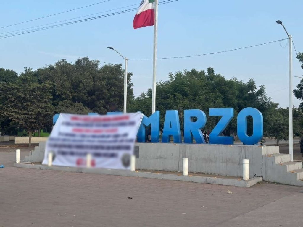 Buenavista, Mich.- 25 de noviembre de 2025.- La mañana de este martes, habitantes de la localidad 18 de Marzo se sorprendieron al descubrir una narcomanta colocada en las letras monumentales situadas en la plaza principal, a un costado de la carretera Apatzingán-Tepalcatepec.