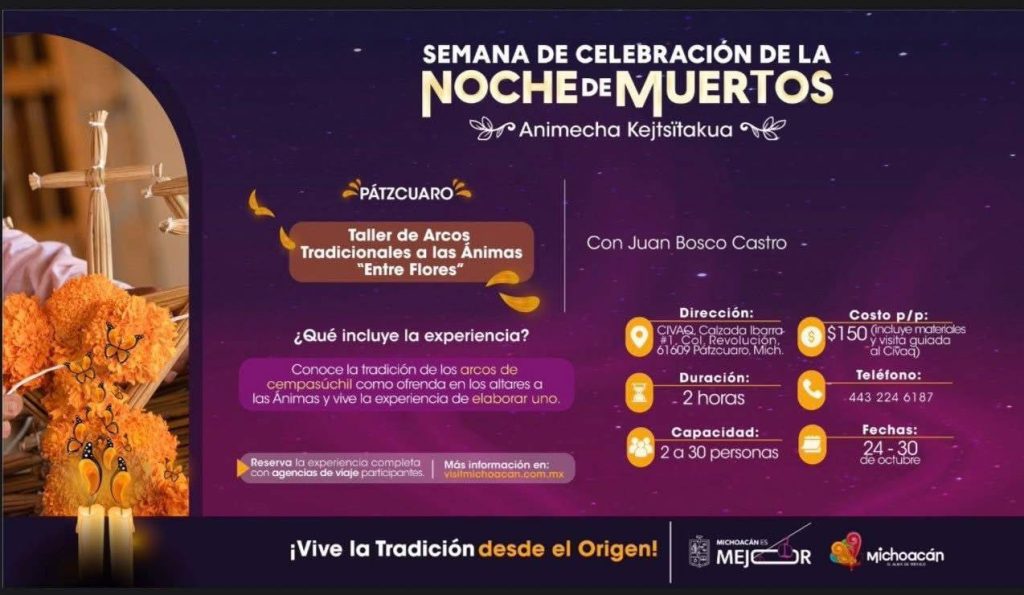 En el marco de la Semana de Celebración de Noche de Muertos, la Secretaría de Turismo de Michoacán (Sectur), a cargo de Roberto Monroy García, invita al taller “Entre flores”, que se llevará a cabo en el Centro de Interpretación Vasco de Quiroga (Civaq) en Pátzcuaro, el cual se localiza en calzada Ibarra 1, colonia Revolución, donde era la antigua estación del tren.