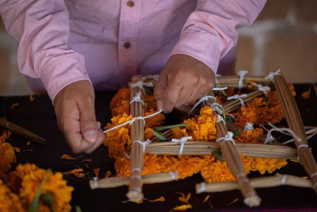 Morelia, Michoacán, 21 de octubre de 2025.- Las flores de cempasúchil llenan de vida y color los arcos tradicionales que se elaboran para la Noche de Muertos. Según la tradición, estas ofrendas florales guían, cada 1 y 2 de noviembre, el camino de los difuntos que regresan para compartir la celebración con sus familiares vivos.