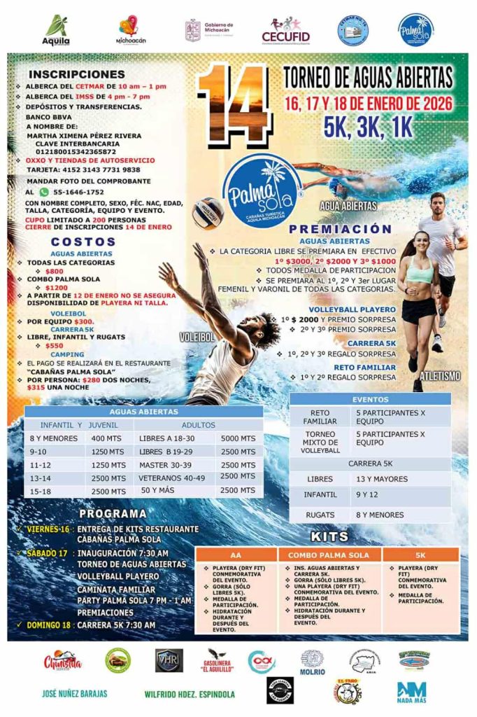 Morelia, Michoacán, 7 de enero de 2026.- El Torneo de natación de Aguas Abiertas 2026 está listo para realizarse del 16 al 18 de enero en la playa Palma Sola, ubicada en el municipio de Aquila, informó Roberto Monroy García, titular de la Secretaría de Turismo de Michoacán (Sectur).