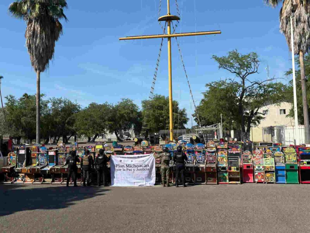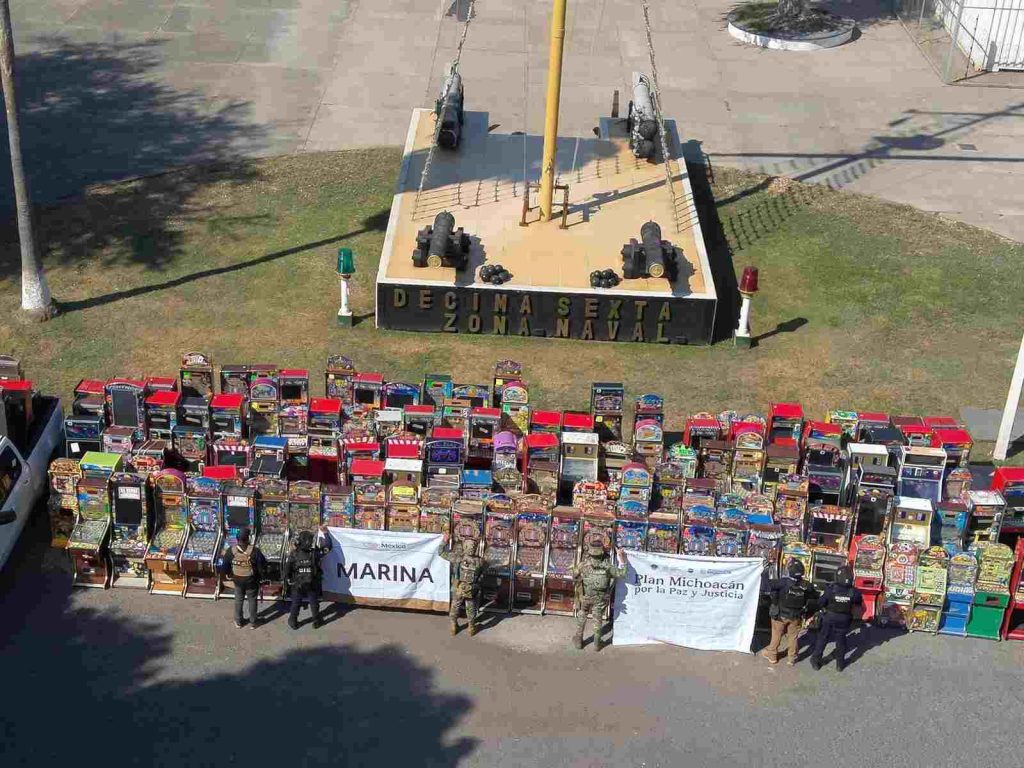 Lázaro Cárdenas, Michoacán, 29 de diciembre de 2025.- En un operativo conjunto, elementos de las secretarías de Seguridad Pública (SSP) y de Marina (Marina), en apoyo a la Fiscalía General del Estado (FGE), aseguraron 183 máquinas tragamonedas en el municipio de Lázaro Cárdenas. La acción derivó de la cumplimentación de 13 órdenes de cateo en diversos inmuebles y una intervención adicional en flagrancia.