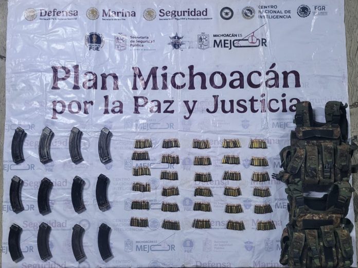 Buenavista, Michoacán, 29 de enero de 2026.- Como resultado de una acción operativa y estratégica, elementos de las secretarías de Seguridad Pública (SSP) y de la Defensa Nacional (Defensa) aseguraron 300 cartuchos útiles, 12 cargadores y equipo balístico en el municipio de Buenavista.
