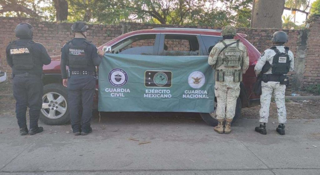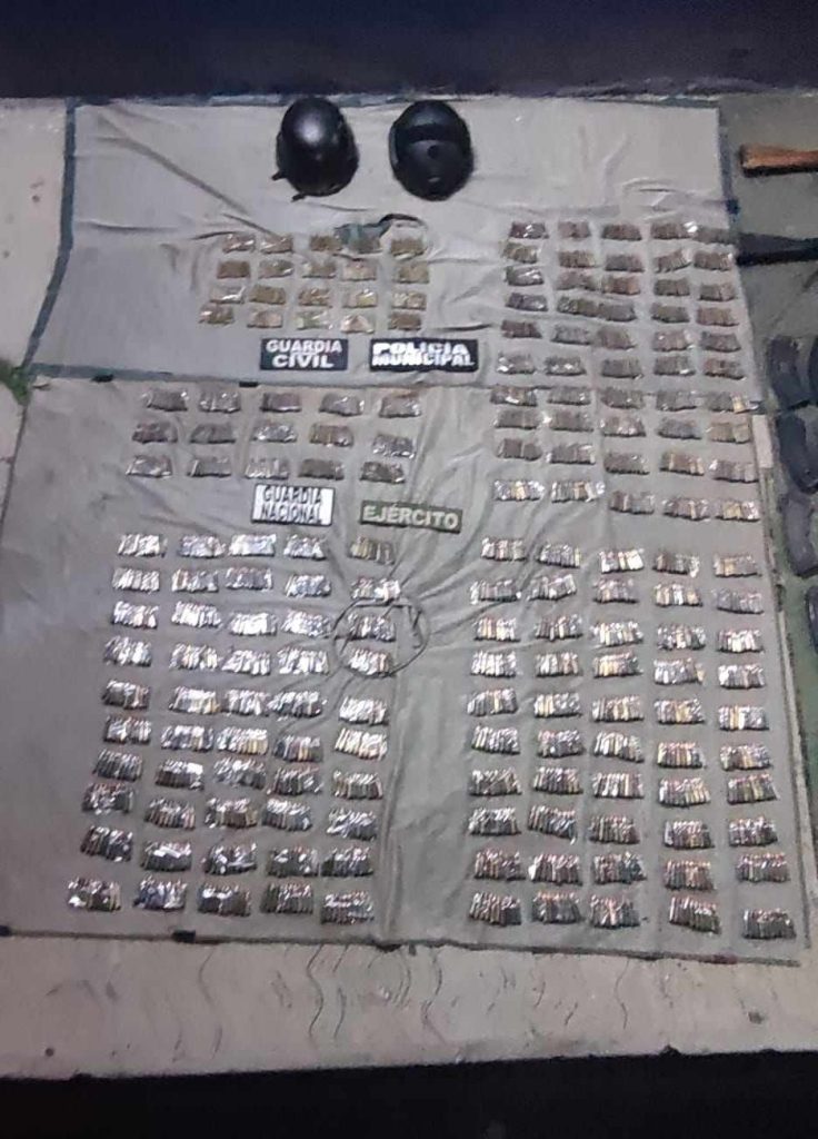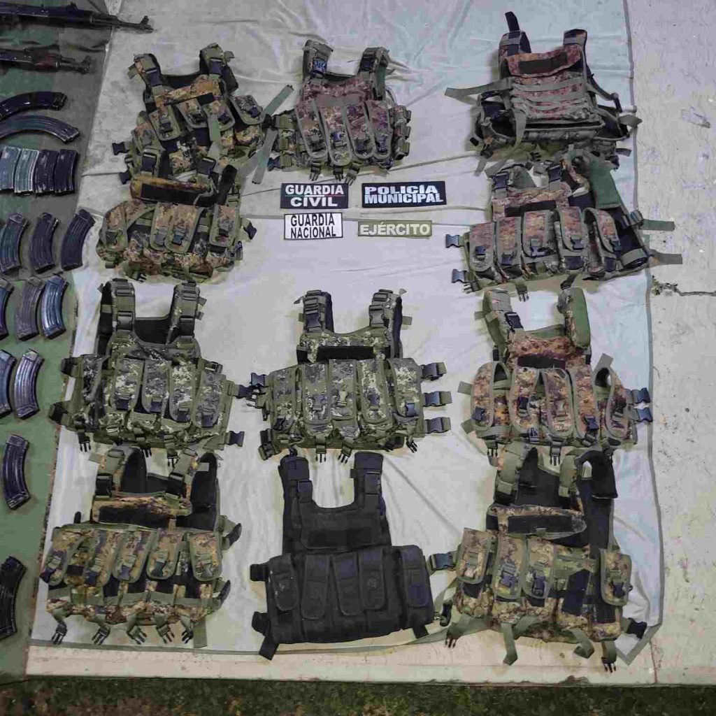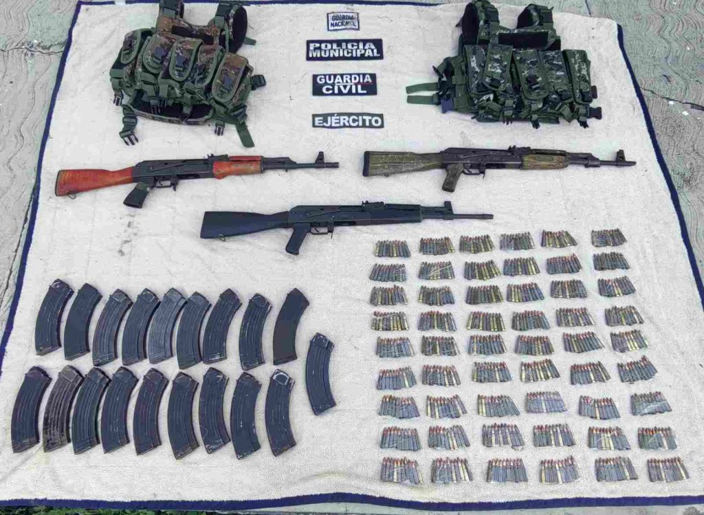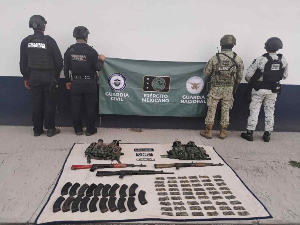 En un primer suceso efectuado, en la localidad 5 de Mayo, los elementos de la Guardia Civil, el Ejército Mexicano y la Guardia Nacional decomisaron cuatro armas de fuego calibre 7.62X39 milímetros, mil 850 cartuchos útiles, 95 cargadores, cascos y chalecos balísticos, así como una camioneta marca Nissan.