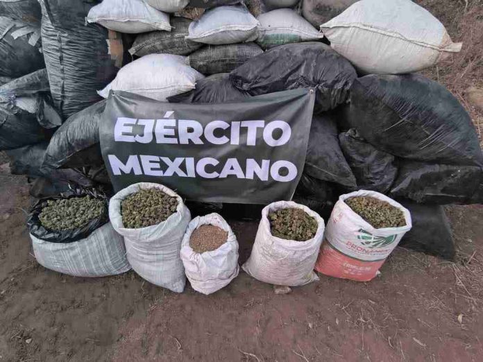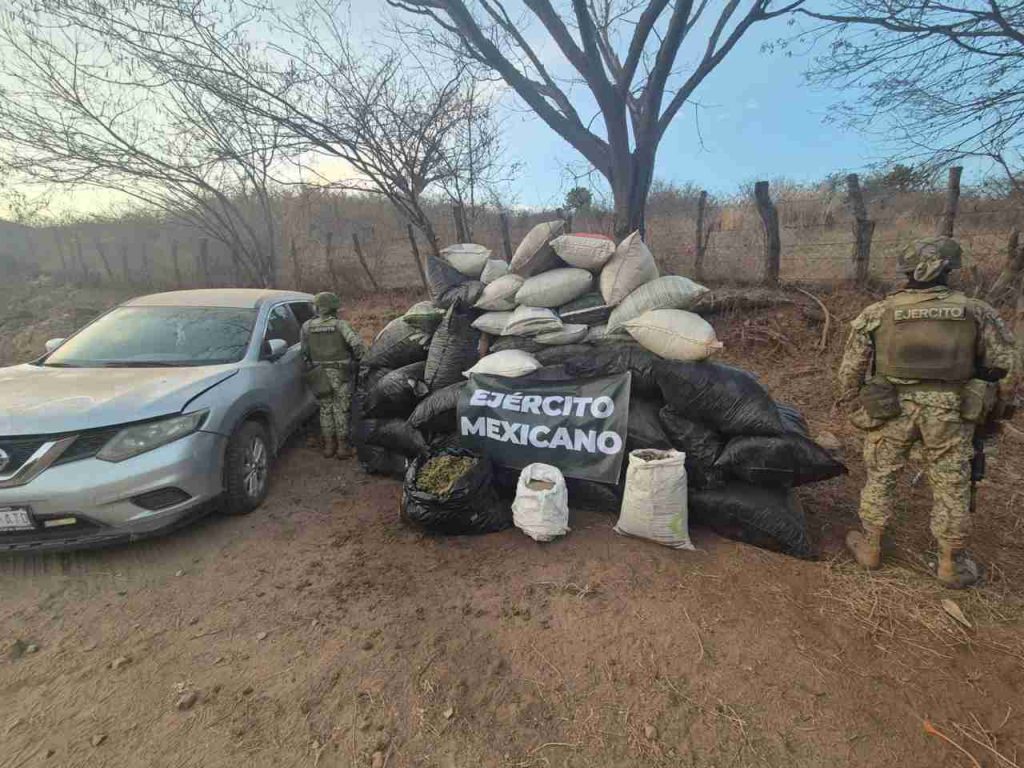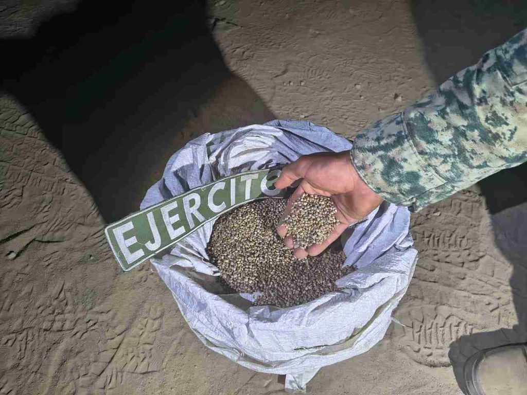 Durante las labores de reconocimiento, el personal federal localizó 40 costales con hierba verde y seca con características similares a la marihuana, con un peso aproximado de mil 75 kilogramos, así como 23 kilogramos de semilla del mismo enervante.