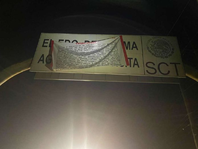 Coahuayana, Mich.- 27 de diciembre de 2025.- Varias narcomantas fueron localizadas colgadas en el arco del puente Coahuayana, mismo que divide a los estados de Michoacán y Colima.