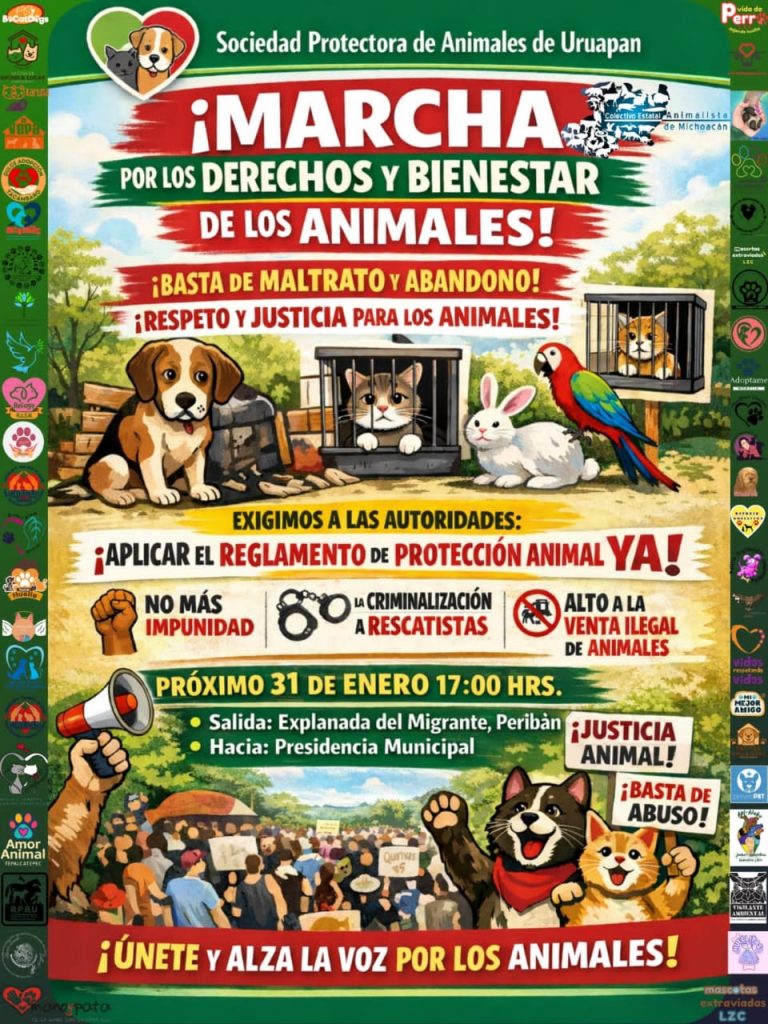 En Uruapan, la Unión de Asociaciones y Rescatistas de Uruapan por la Protección Animal (UARUPA), junto con la Asociación Protectora de Animales de Uruapan (APAU), llevará a cabo una marcha el próximo 31 de enero, a las 16:00 horas, partiendo de la glorieta de McDonald’s.