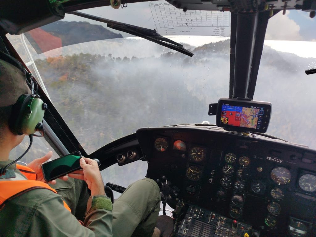 Nuevo Urecho, Michoacán, 8 de abril de 2026.- Con el objetivo de sofocar el incendio forestal registrado en la localidad de La Cebadilla, el Gobierno de Michoacán fortaleció el despliegue operativo en el municipio de Nuevo Urecho. La estrategia incluye el apoyo aéreo de un helicóptero equipado con helibalde, perteneciente a la Secretaría de Seguridad Pública.