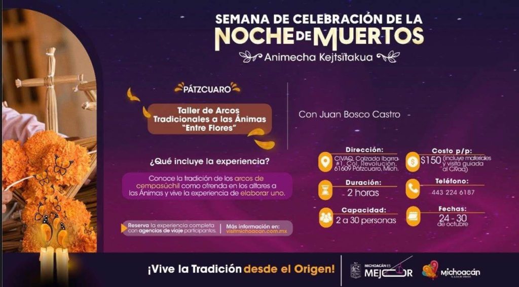 Entre ellos se encuentra el de Arcos Tradicionales a las Ánimas “Entre Flores”, que se realiza en las instalaciones del Centro de Interpretación Vasco de Quiroga (Civaq) en Pátzcuaro, ubicado en calzada Ibarra 1, colonia Revolución, donde antes se encontraba la estación del tren.