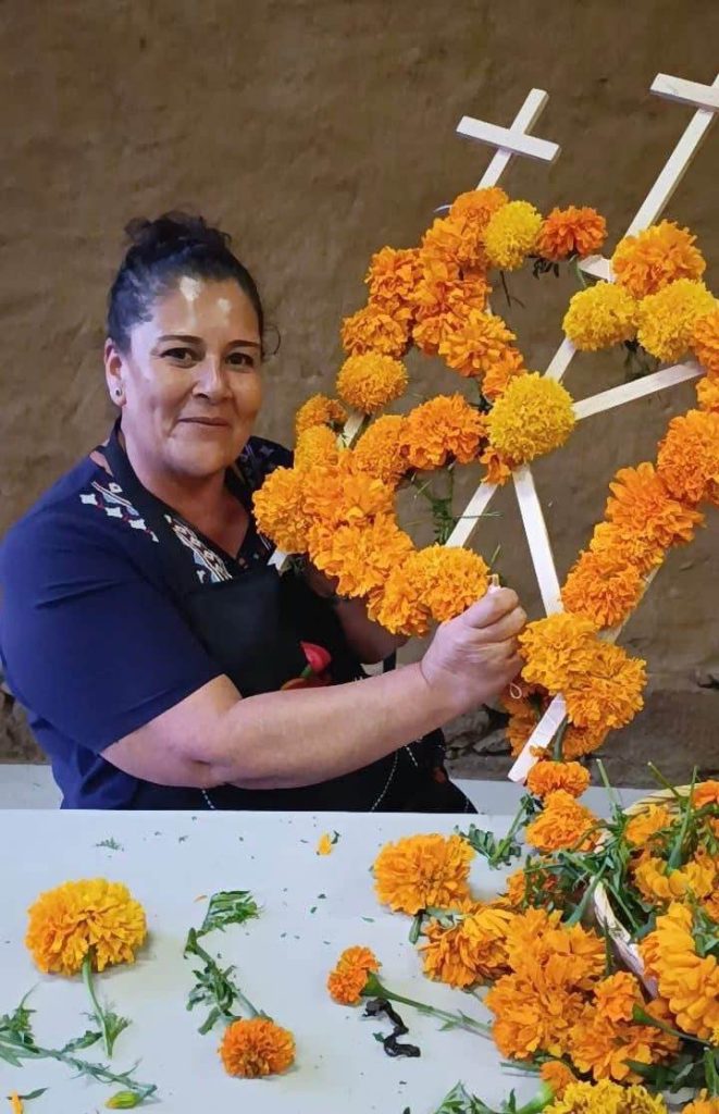 Los asistentes son guiados paso a paso para la elaboración de estos tradicionales arcos que se encuentran en los panteones el 1 y 2 de noviembre, realizados para recibir a los que se adelantaron en el camino.