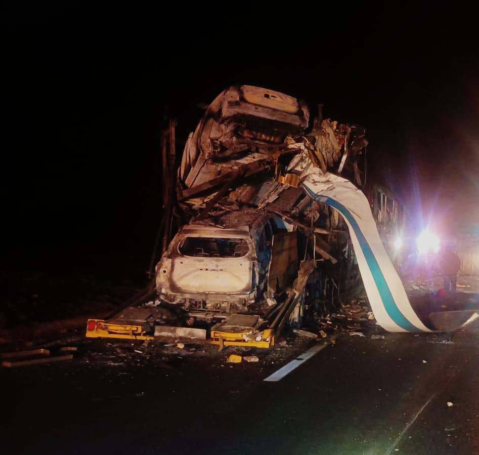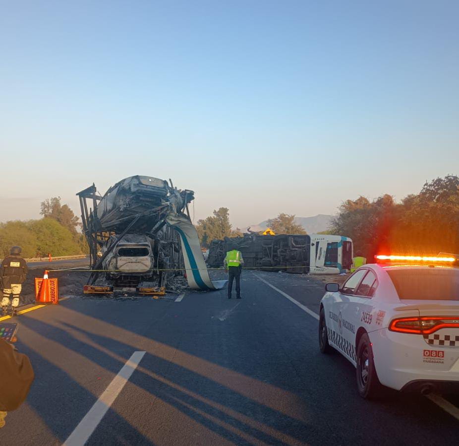 Vista Hermosa, Mich.- 24 de febrero de 2026.- Dos personas sin identificar, un hombre y una mujer, fallecieron luego de que un autobús de pasajeros se estrellara contra la parte trasera de una madrina calcinada que permanecía sobre la autopista México-Guadalajara, a la altura del kilómetro 391+900, en el tramo correspondiente a este municipio.