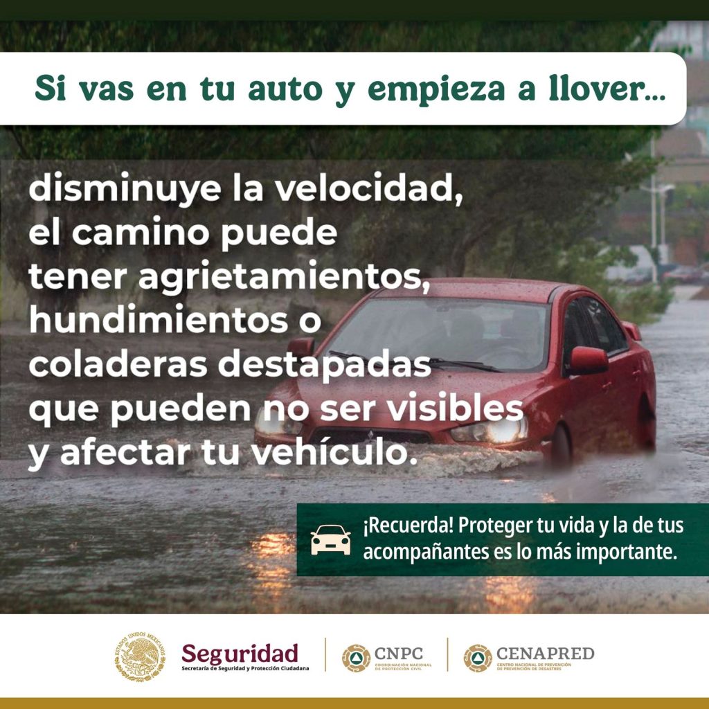 Ante este panorama, se recomienda evitar el cruce de ríos o vialidades con acumulación de agua y mantenerse alejados de zonas de laderas o barrancas por el riesgo de reblandecimiento de tierra.