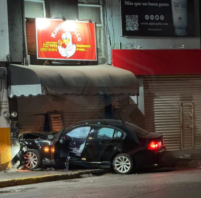 La Piedad, Mich.- 6 de diciembre de 2025.- Un fuerte estruendo despertó a los vecinos del bulevar Adolfo López Mateos de La Piedad minutos antes del amanecer de este sábado, luego de que un vehículo BMW 323, terminara estrellado contra la fachada del negocio “King Pollo”.