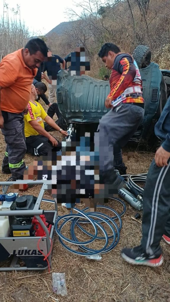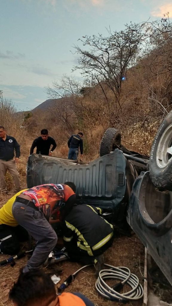 A su llegada los socorristas descendieron por terreno agreste y al fondo del desnivel hallaron una camioneta de color verde totalmente destrozada, aún en su interior localizaron a varios lesionados, por lo que con apoyo de equipo hidráulico realizaron las maniobras para su liberación.