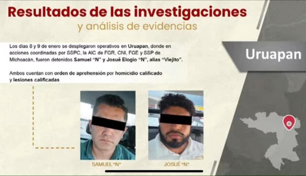 García Harfuch detalló que, derivado del análisis de evidencias y del trabajo de inteligencia, el pasado 8 y 9 de enero se desplegaron operativos en el municipio de Uruapan, donde fueron detenidos Samuel “N” y Josué Elogio “N”, alias “Viejito”.