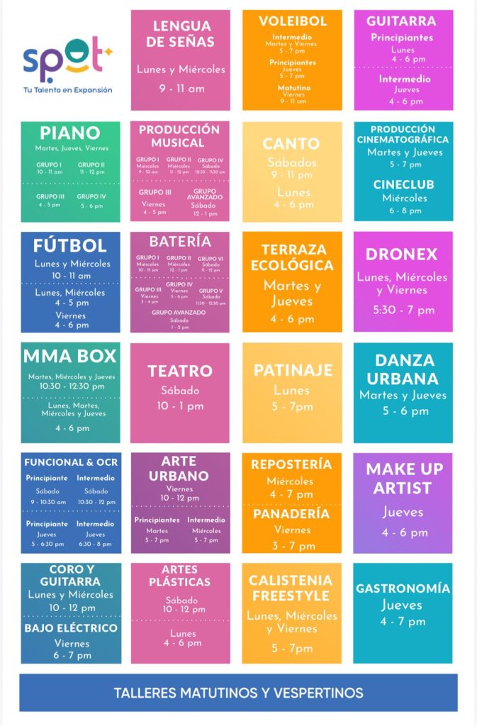 Los Centros Spot también brindan atención integral con apoyo psicológico, consulta con nutriólogo, espacios ideales para socializar y hacer nuevos amigos. Están abiertos de lunes a viernes de 8:30 a 20: 30 horas y los sábados de 9:00 a 14:00 horas, lo que permite a los jóvenes aprovechar el espacio durante gran parte del día.
