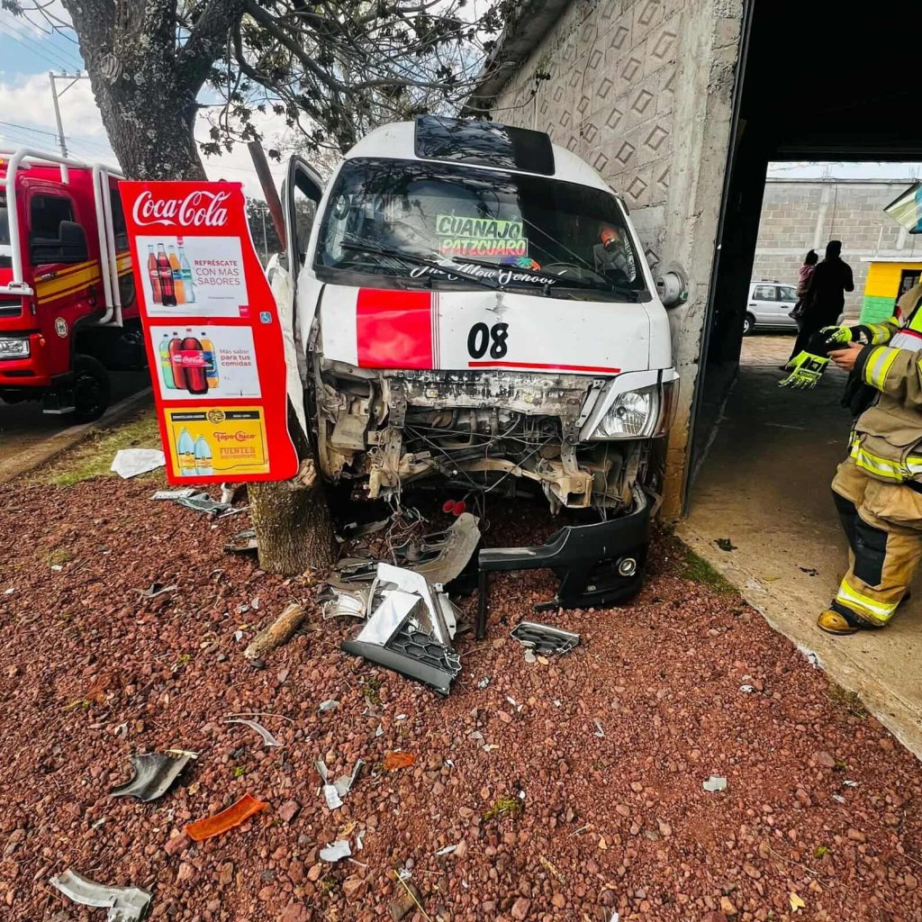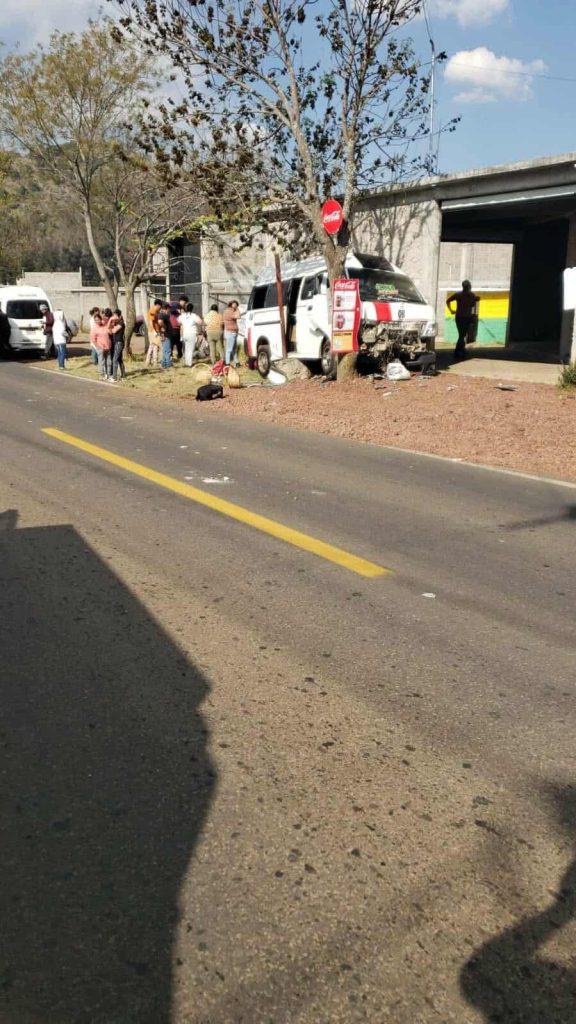 Huiramba, Mich.- Lunes 09 de febrero de 2026.– Una combi de la Ruta Cuanajo chocó contra un árbol ubicado a la orilla de la carretera Pátzcuaro-Morelia. En el vehículo viajaban nueve pasajeros, pero sólo dos de ellos padecieron lesiones de consideración y requirieron traslado hospitalario, informaron fuentes de rescate.