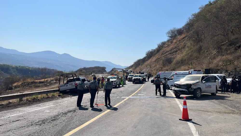 Paramédicos de Ambumed acudieron al lugar para brindar atención prehospitalaria a los oficiales lesionados, quienes posteriormente fueron trasladados a un hospital en la ciudad de Uruapan para su valoración médica.