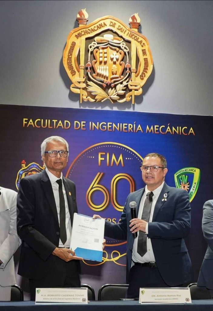 Morelia, Michoacán, a 05 de noviembre de 2025.- En el marco de la conmemoración del 60 aniversario de la Facultad de Ingeniería Mecánica de la Universidad Michoacana de San Nicolás de Hidalgo (UMSNH), el secretario Académico, Antonio Ramos Paz, en representación de la rectora Yarabí Ávila González, indicó que este día también se celebra un logro que da cuenta de la calidad y el compromiso académico de la dependencia, con la entrega de la constancia de acreditación del programa de Ingeniería Mecatrónica por parte de los Comités Interinstitucionales de Evaluación para la Educación Superior (CIEES).