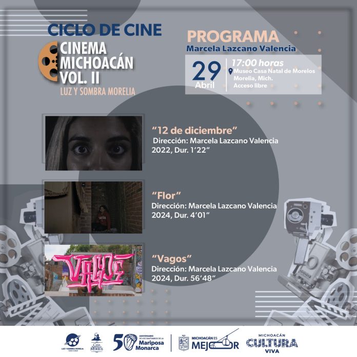 Morelia, Michoacán, 24 de abril de 2025.- La sensibilidad y el talento joven enriquecen la mirada del cine michoacano en Cinema Michoacán Vol. II, con la proyección de tres obras dirigidas por Marcela Lazcano Valencia, una joven creadora originaria de Morelia.