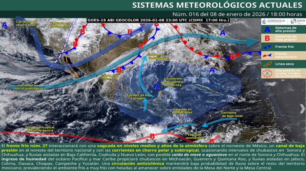 Adicionalmente, una vaguada en niveles medios y altos de la atmósfera, en combinación con las corrientes en chorro polar y subtropical, dará origen a la segunda tormenta invernal de la temporada, que generará ambiente muy frío a gélido, rachas muy fuertes de viento y probabilidad de caída de nieve o aguanieve en zonas de Sinaloa, Durango, Chihuahua, Coahuila, Nuevo León, San Luis Potosí, Zacatecas, así como en cimas montañosas del centro y oriente del país.