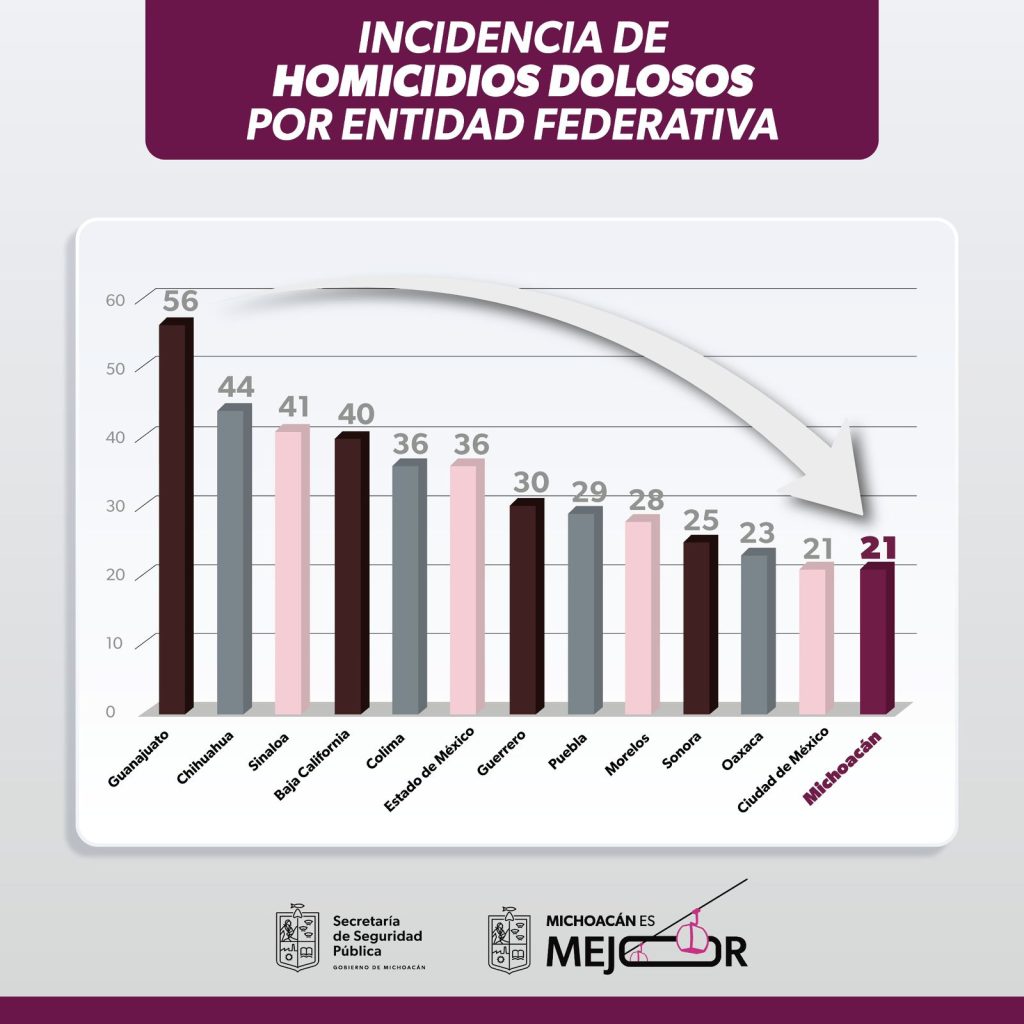 Morelia, Michoacán, 12 de noviembre de 2025.- De acuerdo con el reporte nacional de este miércoles, Michoacán salió de los primeros 10 estados con más casos de homicidio doloso, colocándose en la posición número 13.