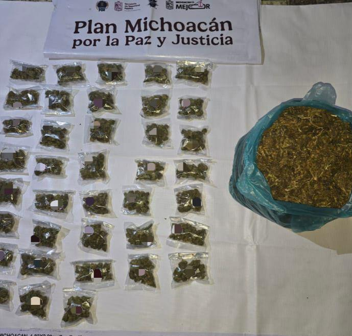 Mientras que en Tingambato, personal de la SSP, la Secretaría de la Defensa Nacional (Defensa) y la Secretaría de Seguridad y Protección Ciudadana (SSPC) aseguró más de un kilogramo de mariguana, localizada dentro de una bolsa y en 39 dosis selladas con logos alusivos a un grupo delictivo.