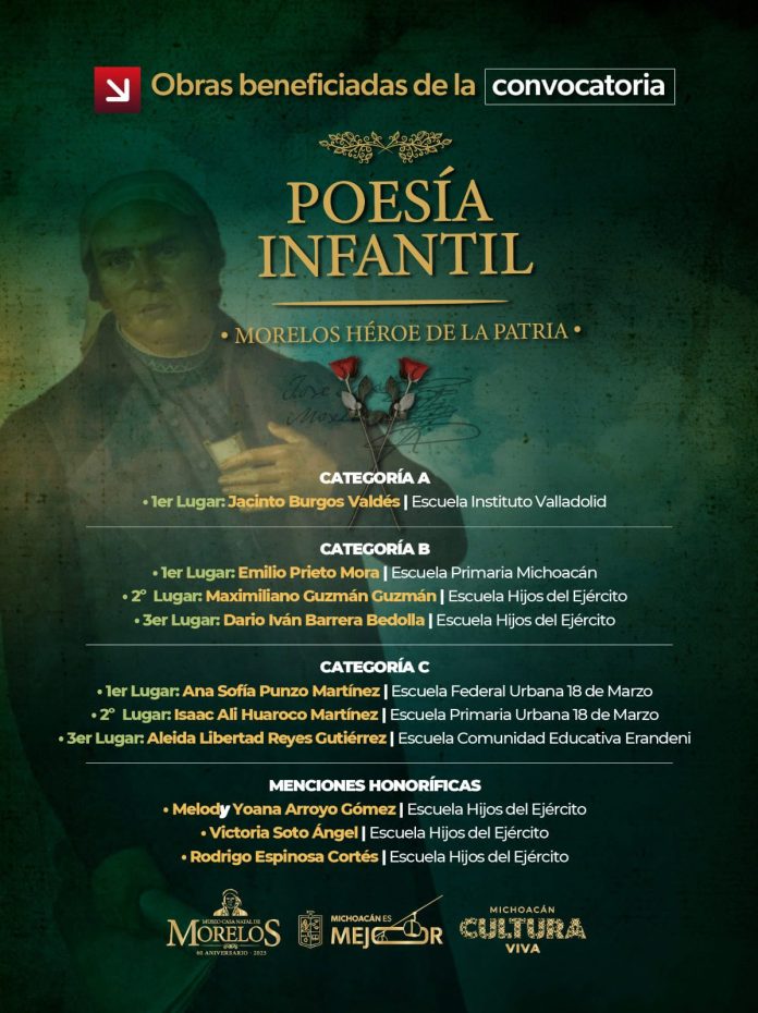 En total se recibieron 26 poemas, que mostraron la creatividad, imaginación y sensibilidad de las infancias. En la categoría A, el primer lugar fue para Jacinto Burgos Valdés, de la Escuela Instituto Valladolid. En la categoría B, Emilio Prieto Mora obtuvo el primer sitio, de la Escuela Primaria Michoacán; el segundo fue para Maximiliano Guzmán Guzmán y el tercero para Darío Iván Barrera Bedolla, ambos de la Escuela Hijos del Ejército.