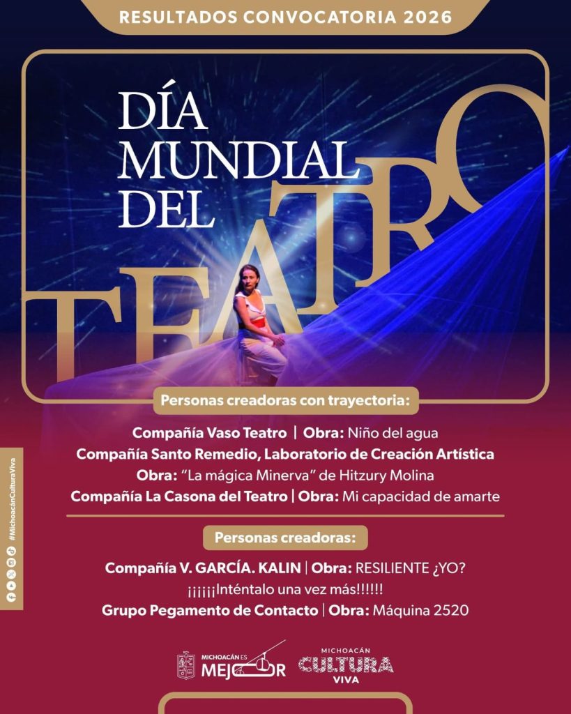 Morelia, Michoacán, 26 de febrero de 2026.- La Secretaría de Cultura de Michoacán (Secum) dio a conocer los resultados de la convocatoria para integrar la programación oficial del Día Mundial del Teatro 2026, celebración que llevará funciones escénicas a distintos municipios del estado con el propósito de acercar el teatro a más públicos.