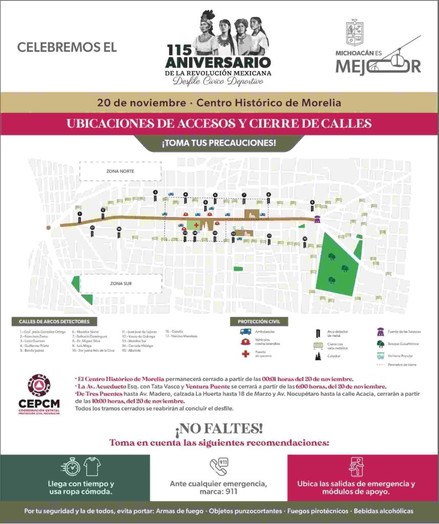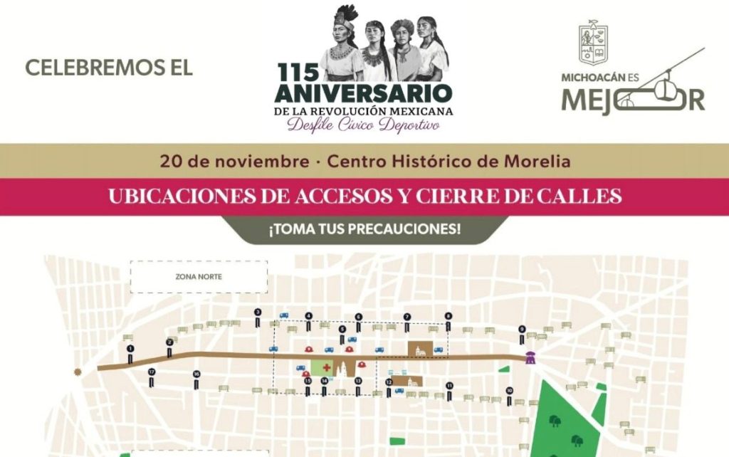Morelia, Michoacán, 19 de noviembre de 2025.- La Secretaría de Seguridad Pública (SSP) informa que a partir de las 00:01 horas del jueves 20 de noviembre iniciarán los cierres vehiculares en calles y avenidas del Centro Histórico de Morelia, con motivo del desfile del 115 Aniversario de la Revolución Mexicana.