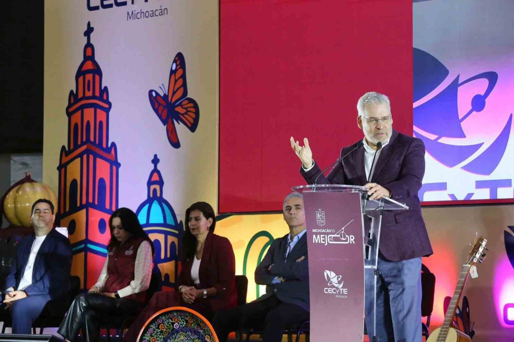 Acompañaron al gobernador, Iván Flores Benites, coordinador nacional de los Cecytes; Raúl Zepeda Villaseñor, secretario de Gobierno; Gabriela Molina Aguilar, secretaria de Educación; Mariana Sosa Olmeda, directora del Instituto de Educación Media Superior y Superior; Juan Carlos Velasco Procell, director general del Colegio de Estudios Científicos y Tecnológicos de Michoacán; Homero Meneses Hernández, secretario de Educación de Tlaxcala; Walter Zamarrón Estrada, coordinador de Política Digital de Chihuahua; Alejandra Ochoa Zarzosa, directora del Instituto de Ciencia, Tecnología e Innovación de Michoacán; y jóvenes participantes.