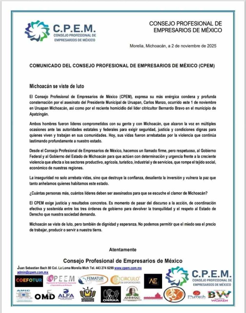 Morelia, Michoacán, 02 de noviembre de 2025.- El Consejo Profesional de Empresarios de México (CPEM) expresó su más enérgica condena y su profunda consternación por el asesinato del presidente municipal de Uruapan, Carlos Manzo, así como el reciente homicidio del líder citricultor Bernardo Bravo, en el municipio de Apatzingán.
