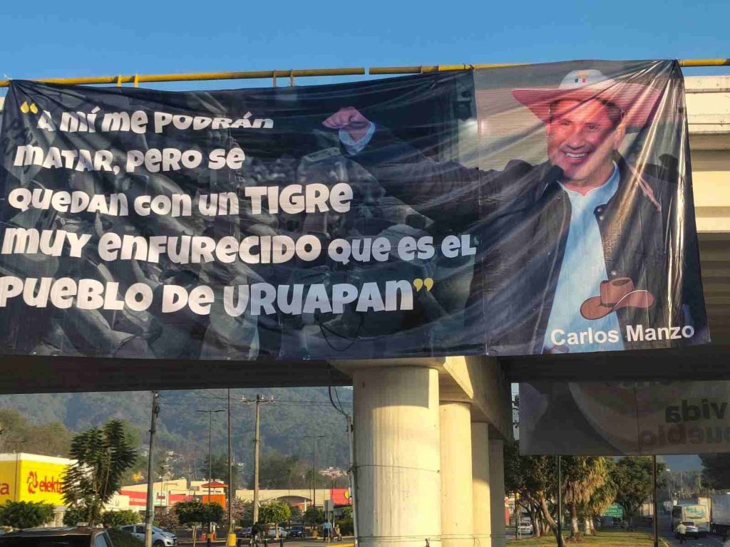 En el Libramiento Oriente, en el sentido sur a norte, pendía una lona acompañada de una fotografía de Carlos Manzo, marcada con un discreto QEPD. El mensaje era contundente, casi un grito escrito: