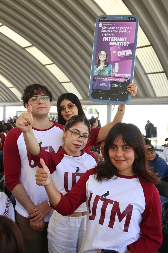 Morelia, Michoacán, 3 de marzo de 2026.- En la Universidad Tecnológica de Morelia (UTM), el gobernador Alfredo Ramírez Bedolla llamó a estudiantes de preparatorias, institutos tecnológicos y universidades públicas de todo el estado a que aprovechen los últimos días de registro al Programa Data, que les ofrecerá 4GB de internet gratuito al mes con acceso a redes sociales, mensajes y llamadas ilimitadas, para fortalecer su formación académica.