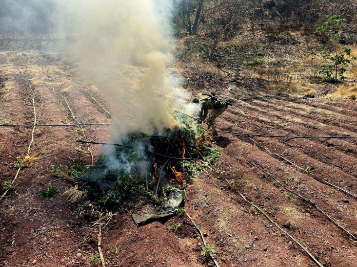 Huetamo, Mich.- 7 de marzo de 2026.- Oficiales del Ejército Mexicano, durante el despliegue permanente que mantienen las fuerzas del orden en la región de Huetamo, localizaron y destruyeron cinco plantíos de marihuana.