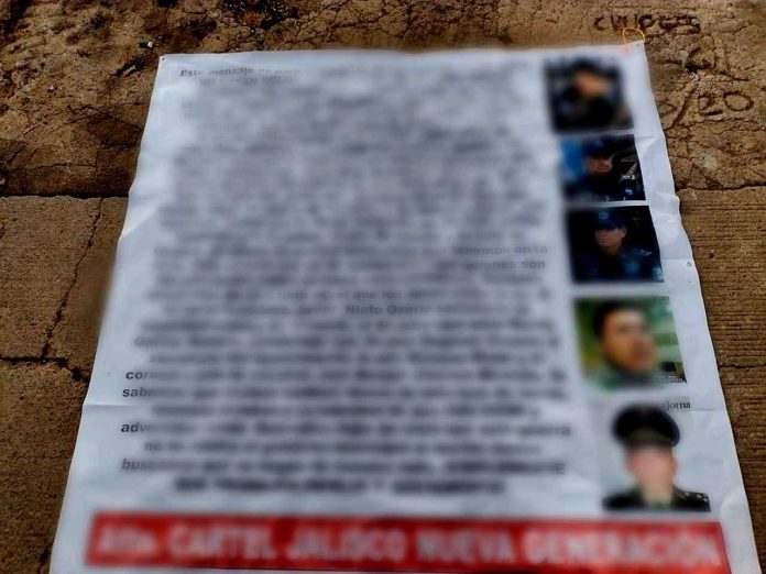 Por lo anterior, oficiales de los tres órdenes de gobierno se desplegaron a dichos puntos y retiraron los rótulos, todos ellos firmados por el Cártel Jalisco Nueva Generación (CJNG), para enseguida ser puestos a disposición de las instancias competentes para las investigaciones correspondientes.