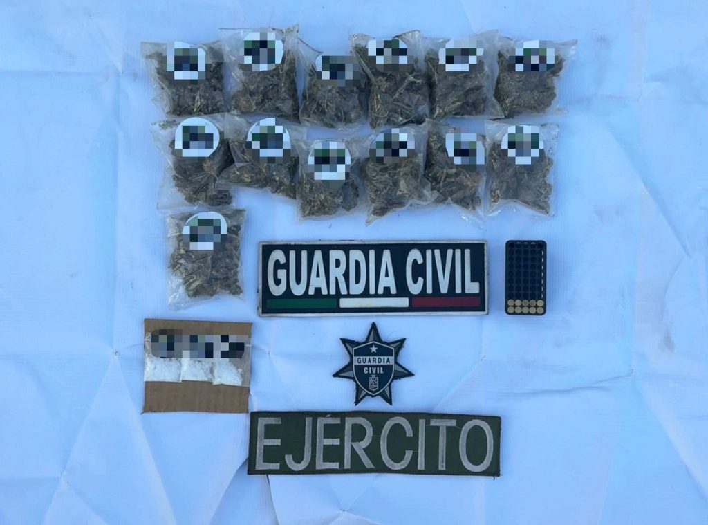 Tras lo anterior, le fueron decomisadas 13 bolsas de plástico con logos alusivos a un grupo delincuencial, cuyo contenido era el enervante conocido como marihuana. También le aseguraron tres dosis más con sustancia granulada blanca, al parecer metanfetamina.