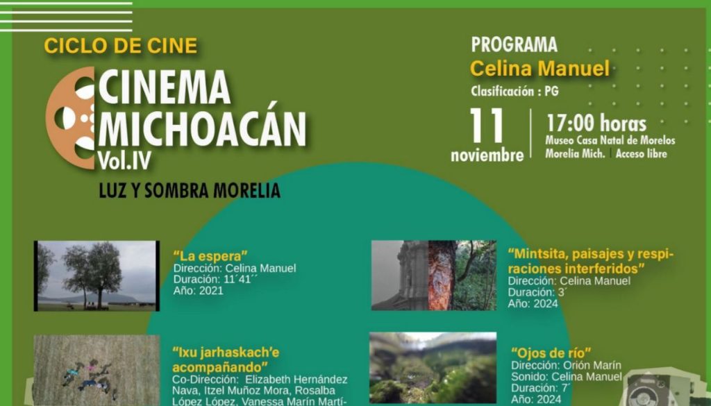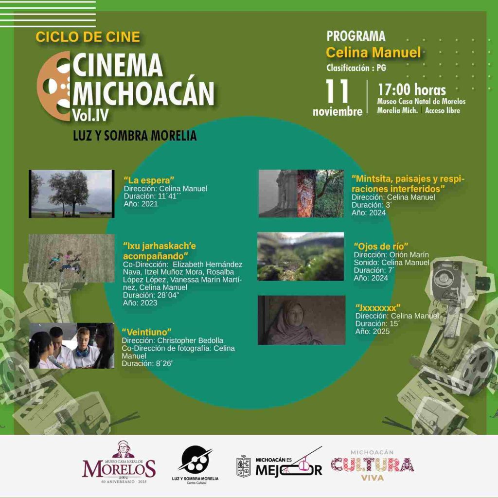 Morelia, Michoacán, 10 de noviembre de 2025.- La Secretaría de Cultura de Michoacán (Secum) invita al público a disfrutar del ciclo “Cinema Michoacán. Volumen IV” durante el mes de noviembre. La iniciativa, que se llevará a cabo en el Museo Casa Natal de Morelos, rinde homenaje al talento de cineastas locales, proyectando cintas de Jorge Sistos Moreno, Celina Manuel, Juan Paulín y Raúl Máximo Cortés.