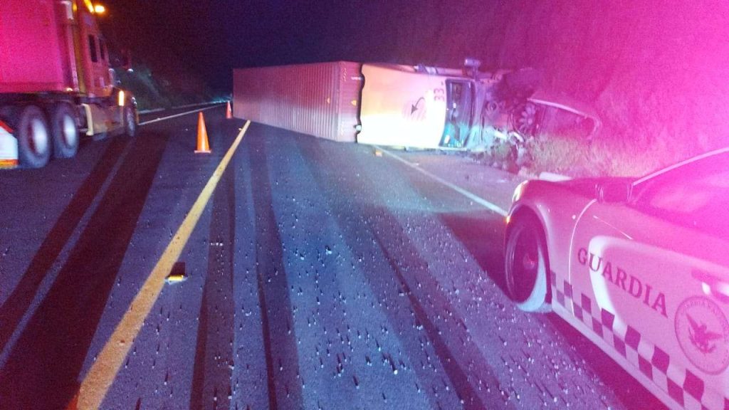 Según el propio conductor, el accidente se produjo al intentar esquivar un vehículo compacto que invadió su carril. Los elementos de la Guardia Nacional División Carreteras y el personal de Auxilio Vial se encargaron de las maniobras de retiro del camión y del restablecimiento de la circulación.
