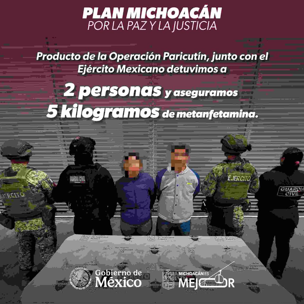 Producto de las labores de vigilancia del Operativo Blindaje Morelia, los agentes de la Guardia Civil y del Ejército Mexicano aseguraron a una mujer y un hombre, quienes iban a bordo de un vehículo que circulaba a exceso de velocidad por la carretera Morelia-Salamanca.