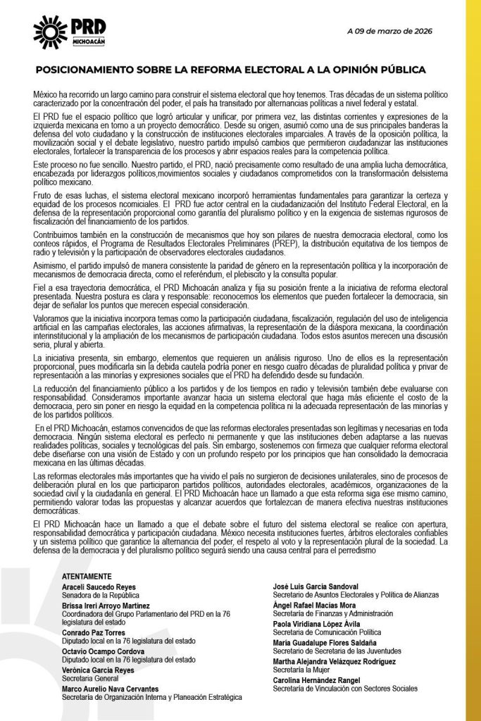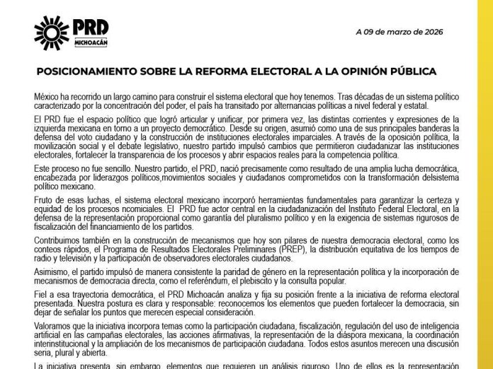 El PRD Michoacán reiteró que el proceso de discusión de la reforma electoral debe considerar la participación de instituciones electorales, especialistas, organizaciones civiles y ciudadanía, con el objetivo de que las modificaciones legales mantengan condiciones de competencia política, reglas claras para los procesos electorales y un sistema de representación que refleje la diversidad política del país.
