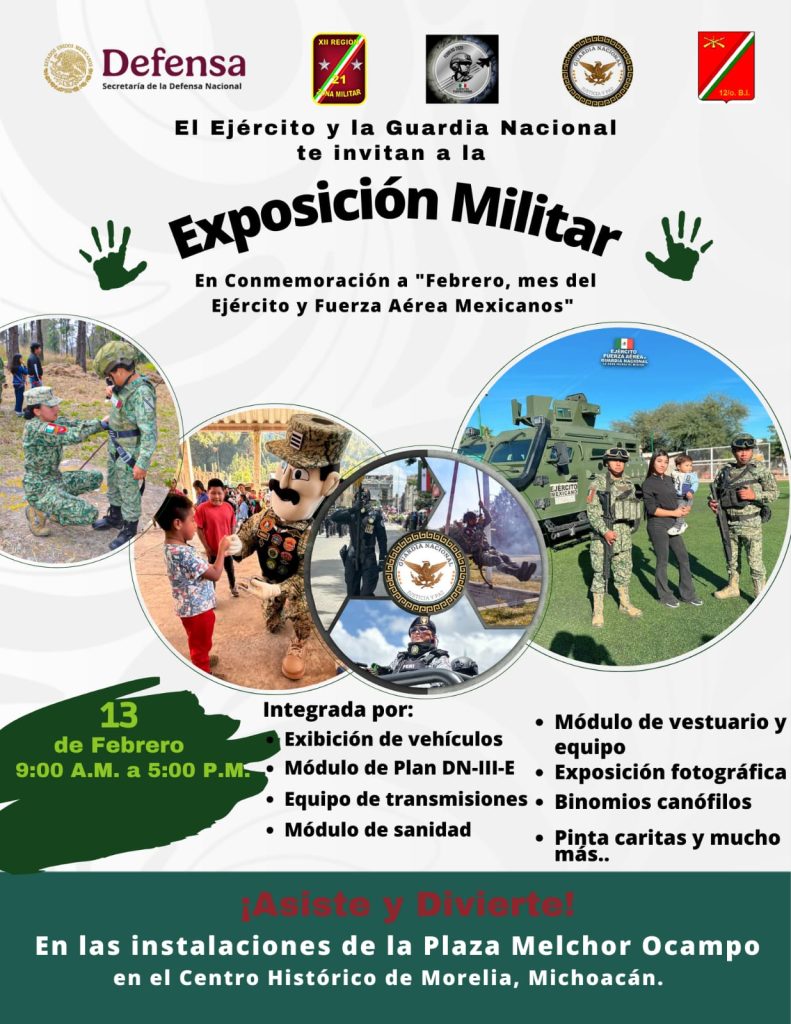 Morelia, Mich. a 12 de febrero de 2026.- en el marco de los eventos de Febrero, mes del Ejército y Fuerza Aérea Mexicanos, la 21/a. Zona Militar, te invita a que asistas en compañía de toda tu familia a la Exposición Militar en Morelia Michoacán.