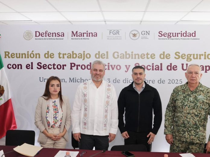 Por instrucciones de la Presidenta Claudia Sheinbaum, y con el objetivo de fortalecer las acciones a favor de la población, los titulares del Gabinete de Seguridad sostuvieron una reunión de trabajo en Uruapan con presidentes municipales, diputadas y diputados locales, así como con autoridades de los tres órdenes de gobierno, con el objetivo de fortalecer las acciones coordinadas y construir soluciones conjuntas en materia de seguridad.