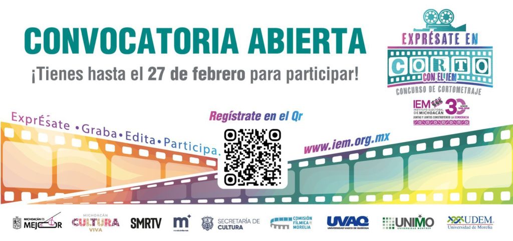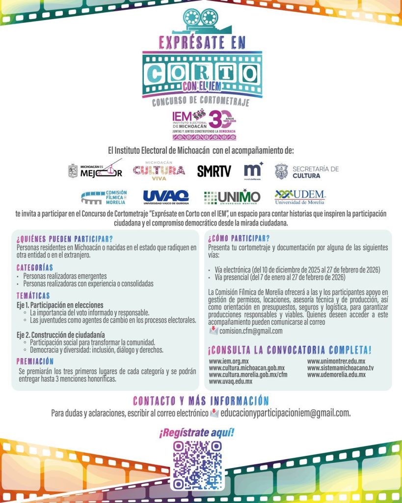 Morelia, Michoacán 27 de enero de 2026. ¿Tienes una historia que contar y una cámara o un celular para hacerlo? El Instituto Electoral de Michoacán invita a participar en el Concurso de Cortometraje “Exprésate en Corto con el IEM”, un espacio para que la creatividad audiovisual se convierta en una voz ciudadana que reflexione, cuestione y fortalezca la vida democrática.