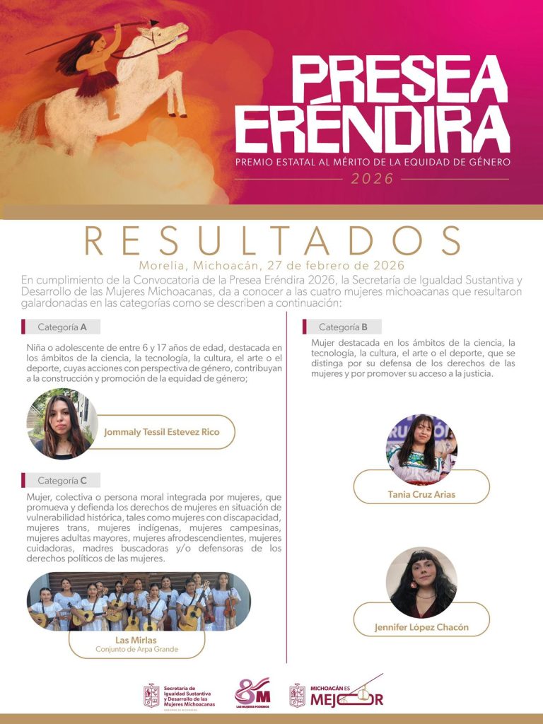 Morelia, Michoacán, 27 de febrero de 2026.- La Secretaría de Igualdad Sustantiva y Desarrollo de las Mujeres Michoacanas (Seimujer) dio a conocer a las ganadoras de la Presea Eréndira 2026, reconocimiento estatal al mérito de la equidad de género que distingue a niñas, adolescentes, mujeres y colectivas cuyas acciones contribuyen a la transformación social y a la defensa de los derechos humanos de las mujeres en el estado.