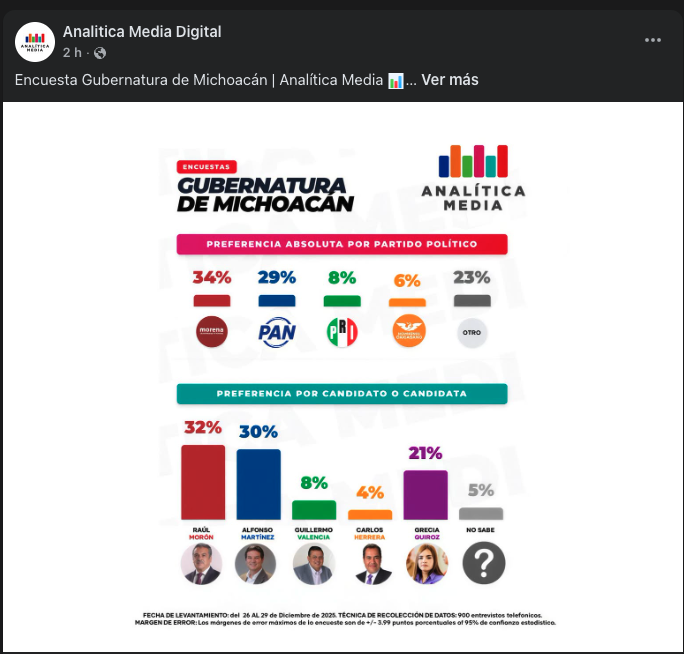 De acuerdo al último estudio de la casa encuestadora, Analítica Media, Alfonso Martínez, alcalde de Morelia, comparte técnicamente el primer puesto con el candidato de Morena, seguido de la candidata independiente y más rezagado, el abanderado del PRI.