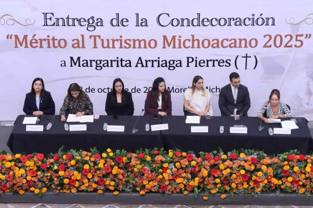 Morelia, Michoacán, a 28 de octubre del 2025.- El Congreso del Estado a través de la Comisión de Turismo, entregó la Condecoración “Mérito al Turismo Michoacano 2025” a Margarita Arriaga Pierres quien, con su esfuerzo, dedicación y compromiso, contribuyó de manera significativa al desarrollo, atención y promoción de la actividad turística en el estado.