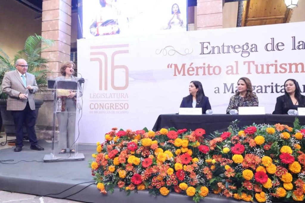 En su intervención, la diputada Giulianna Bugarini Torres, presidenta de la Mesa Directiva del Congreso del Estado, señaló que esta condecoración es un homenaje póstumo a Margarita Arriaga Pierres, dijo que, fue una mujer que dejó huella en la historia del turismo cultural de Michoacán y que transformó, con visión, sensibilidad y compromiso, la manera de comprender y practicar el turismo en México.