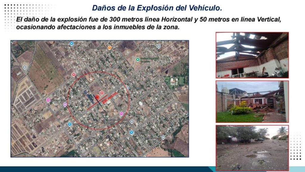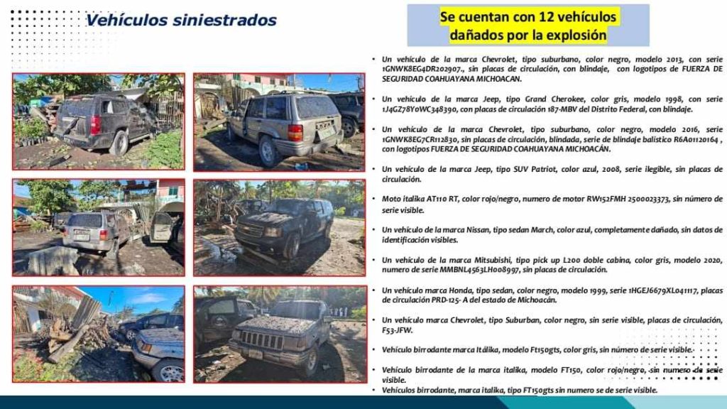La onda expansiva alcanzó los 300 metros en línea horizontal y 50 metros en línea vertical, causando graves afectaciones en inmuebles aledaños y siniestrando un total de 12 vehículos. De esta docena de unidades, tres eran blindadas, dos de ellas camionetas Chevrolet Suburban que portaban logotipos de la “Fuerza de Seguridad Coahuayana Michoacán”, lo que subraya la naturaleza del aparente objetivo atacado.